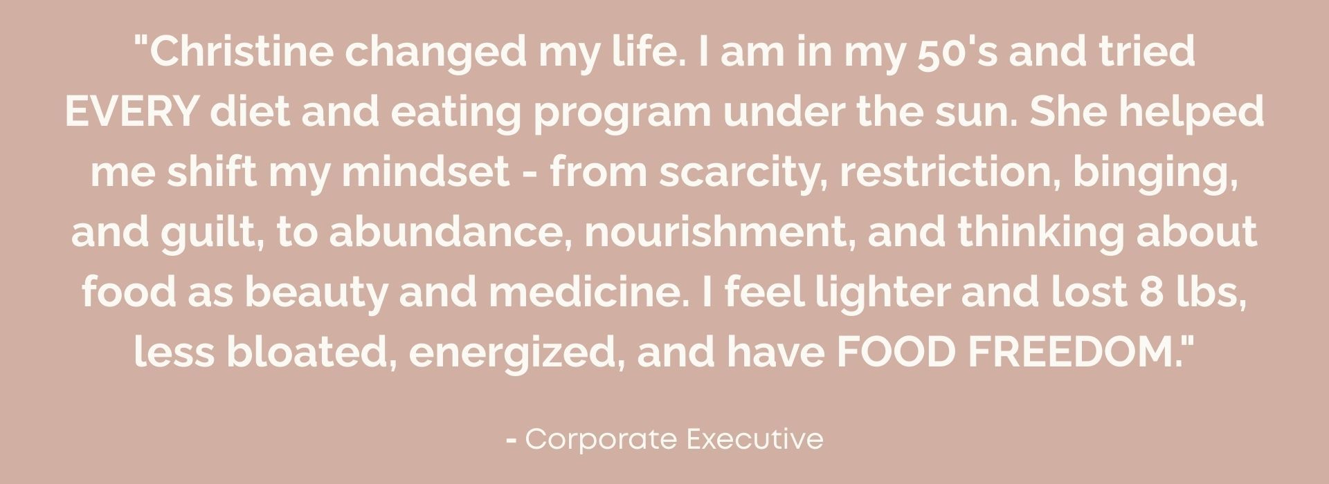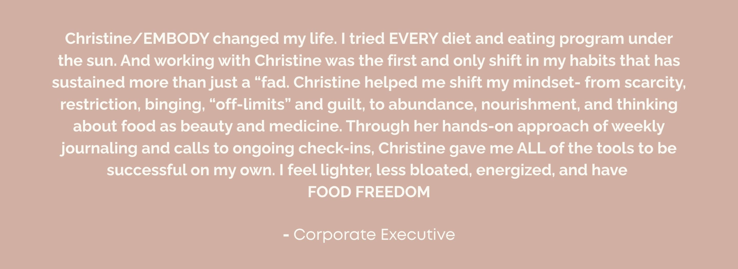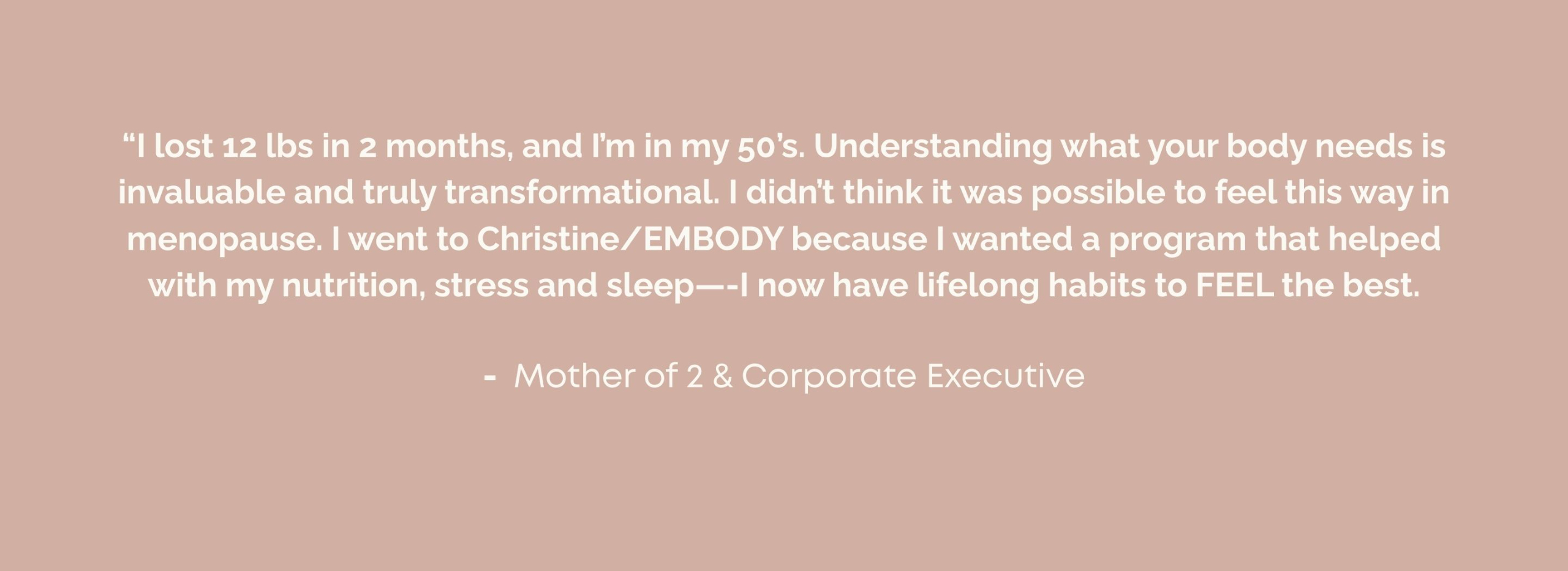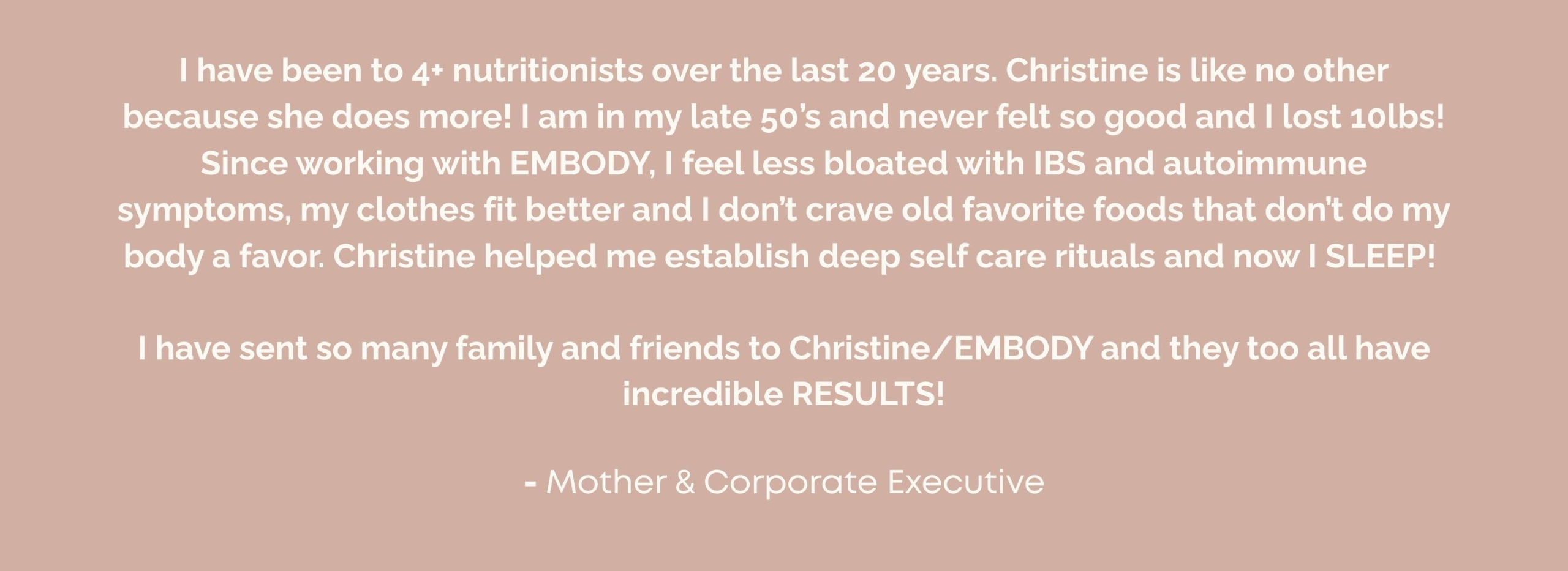 Christine Beal Dunst, Co-founder and CEO of Embody Wellness Company and creator of the Embody Wellness Method™. She created her proprietary 12 -Step Nutrition and Lifestyle Roadmap after empowering thousands of clients over 10 years with proven sustainable results. She is an Integrative Wellness and Nutrition Coach and Behavior Change Consultant. She empowers her clients to connect to the foods and lifestyle choices that work best for their body and produce results—with nourishment and grace every step of the way. She is 50 and believes that you deserve to look and feel your best at any age and is EMBODYING the 12 Roadmap steps daily in her own life.