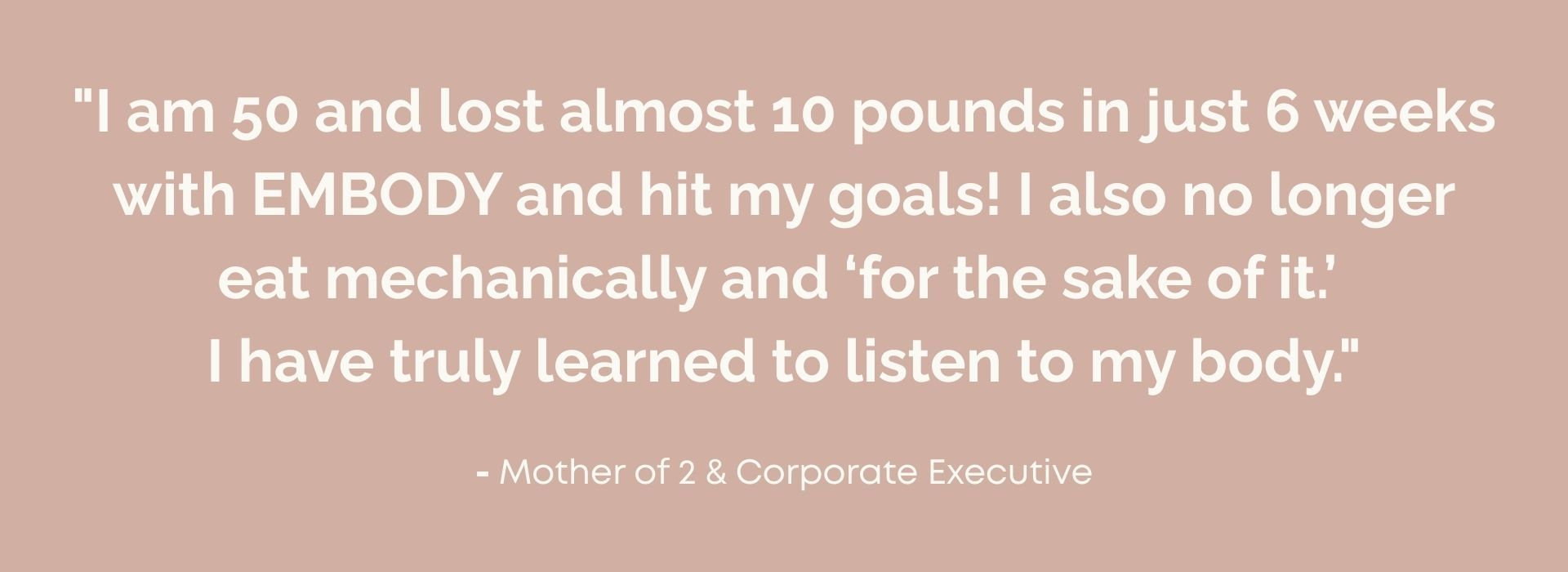 - Optional Online 1:1 Coaching/Nutritionist Support and Electronic EMBODY Nutrition and Lifestyle Journal Add-Ons: for accountability, empowerment and sustainability of results.