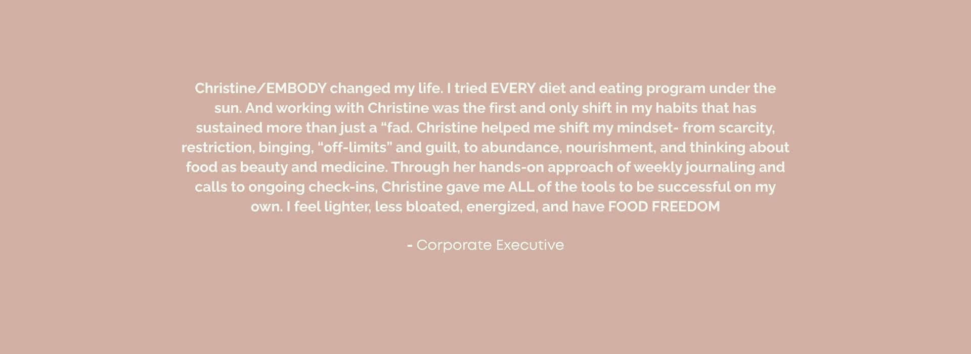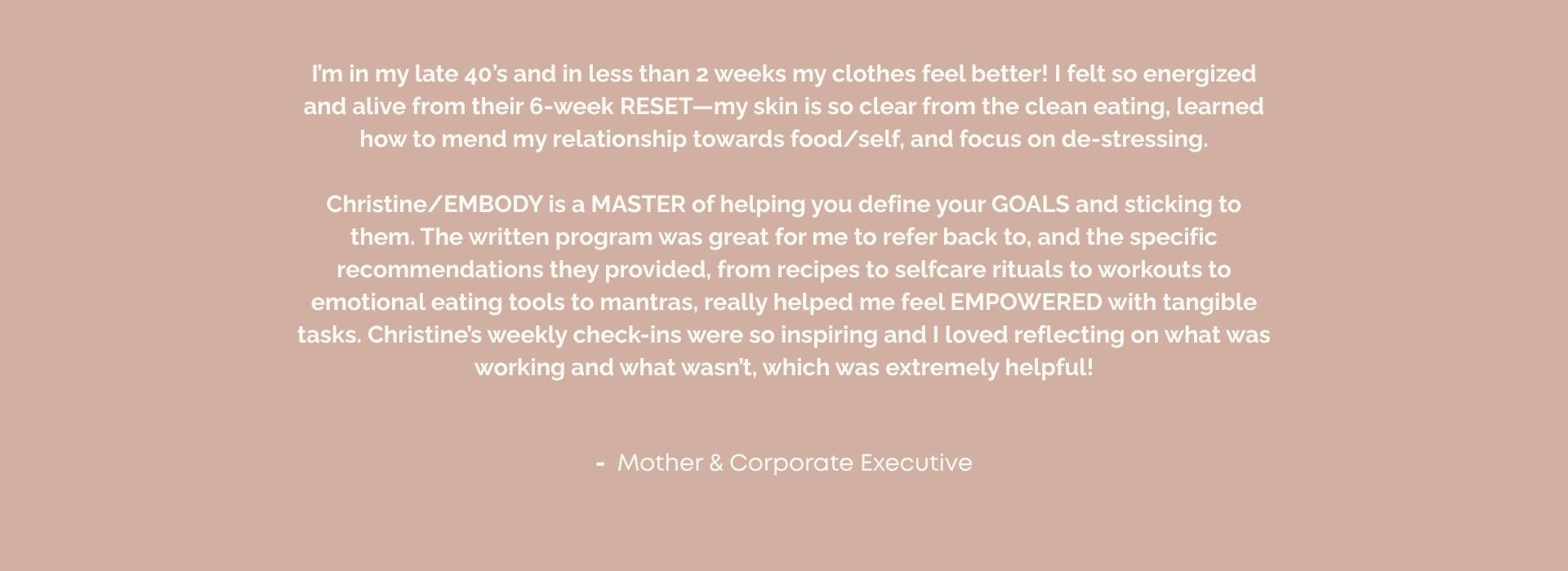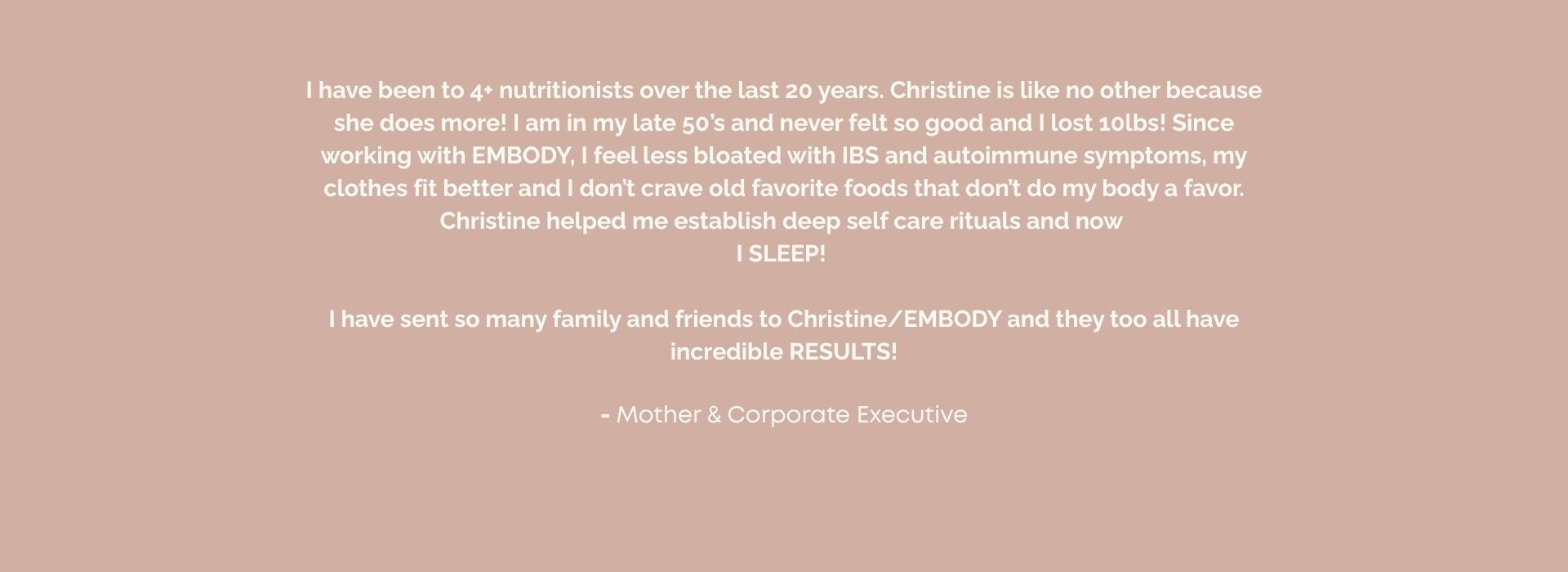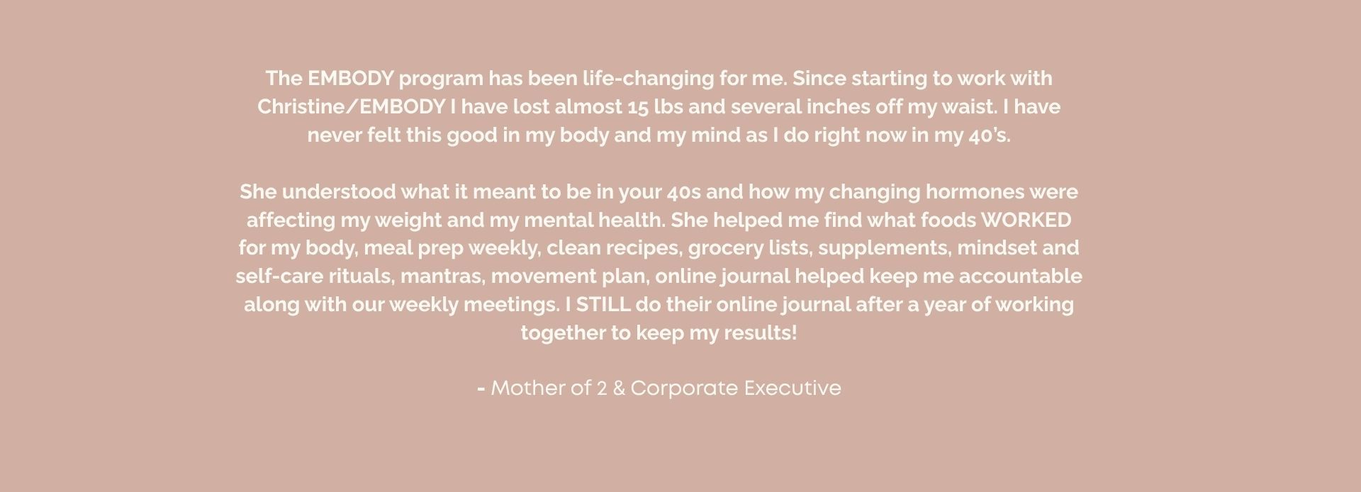 Christine Beal Dunst, Co-founder and CEO of Embody Wellness Company and creator of the Embody Wellness Method™. She created her proprietary 12 -Step Nutrition and Lifestyle Roadmap after empowering thousands of clients over 10 years with proven sustainable results. She is an Integrative Wellness and Nutrition Coach and Behavior Change Consultant. She empowers her clients to connect to the foods and lifestyle choices that work best for their body and produce results—with nourishment and grace every step of the way. She is 50 and believes that you deserve to look and feel your best at any age and is EMBODYING the 12 Roadmap steps daily in her own life.